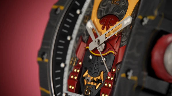 Intricately designed, the golden and crimson hues on the dial are reminiscent of the majestic lacquer and intricate designs found on samurai helmets, signaling wealth and status. These colors aren't chosen at random; they represent the fiery passion and the illustrious prestige of the samurai's life, dedicated to mastery and service.