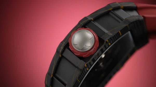 Crafted in NTPT carbon, hundreds of ultra-thin layers are stacked at alternating angles and cured under high temperature and pressure, forming a dense, wave-like grain. The result is an ultra-light case with high rigidity, excellent fatigue resistance, and inherent vibration damping. Its layered architecture echoes the lamellar armor of the samurai—light yet protective and unyielding—bringing tradition meets innovation to the wrist.