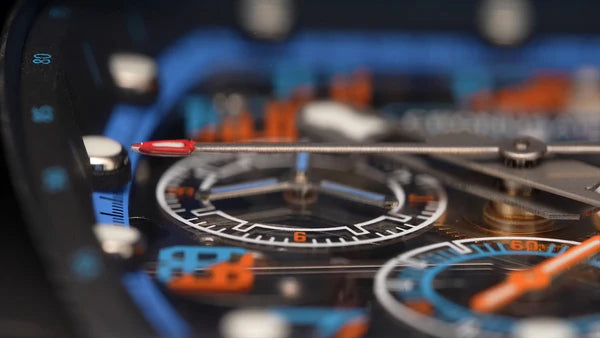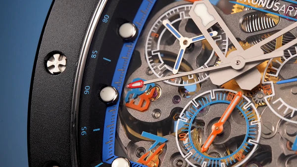 The dial of the watch, with its intricate details and race-inspired colors, mirrors the complex dashboards of F1 vehicles. The vibrant hues are reminiscent of the striking liveries that adorn the cars, each color chosen to stand out on the racetrack and capture the spectator's eye. The hands of the watch, accented with bold colors, sweep with the precision of a finely tuned engine, their movement as smooth and assured as an F1 car rounding a tight corner.