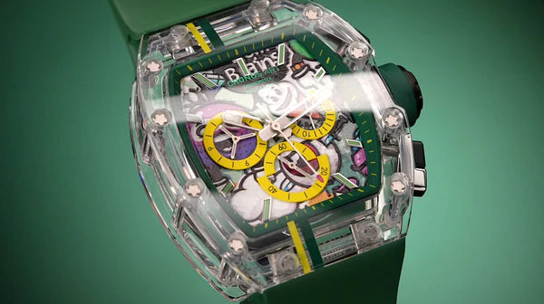 Built from multi-directional carbon laminates and cured under high temperature and pressure, the case reveals a subtle wave-like grain while remaining exceptionally light. Its architecture delivers high rigidity, excellent fatigue resistance, and natural vibration damping for secure, all-day wear. The deep graphite weave frames the electric-green and safety-yellow accents on the dial, creating a dynamic, technical aesthetic without adding bulk.